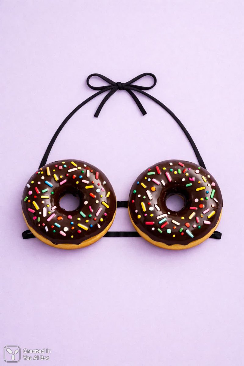 На изображении, созданным нейросетью Sora Image, представлен необычный и забавный сюрреалистический объект – два шоколадных пончика, искусно выложенные в форме бикини-топа. Яркие, разноцветные посыпки динамично разбросаны по поверхности пончиков, создавая яркий визуальный акцент на фоне нежного лавандового фона. Фотография выполнена в минималистичном стиле флэтлей, что позволяет детально рассмотреть текстуру глазури и плавный градиент заднего плана, подчеркивая простоту форм и тщательную проработку каждой детали композиции.