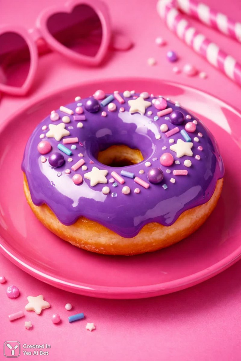 4. a close-up of a glossy donut with a vibrant purple icing, resting on a bright pink plate, playful arrangement, high-definition details, soft studio lighting, whimsical food art photography.