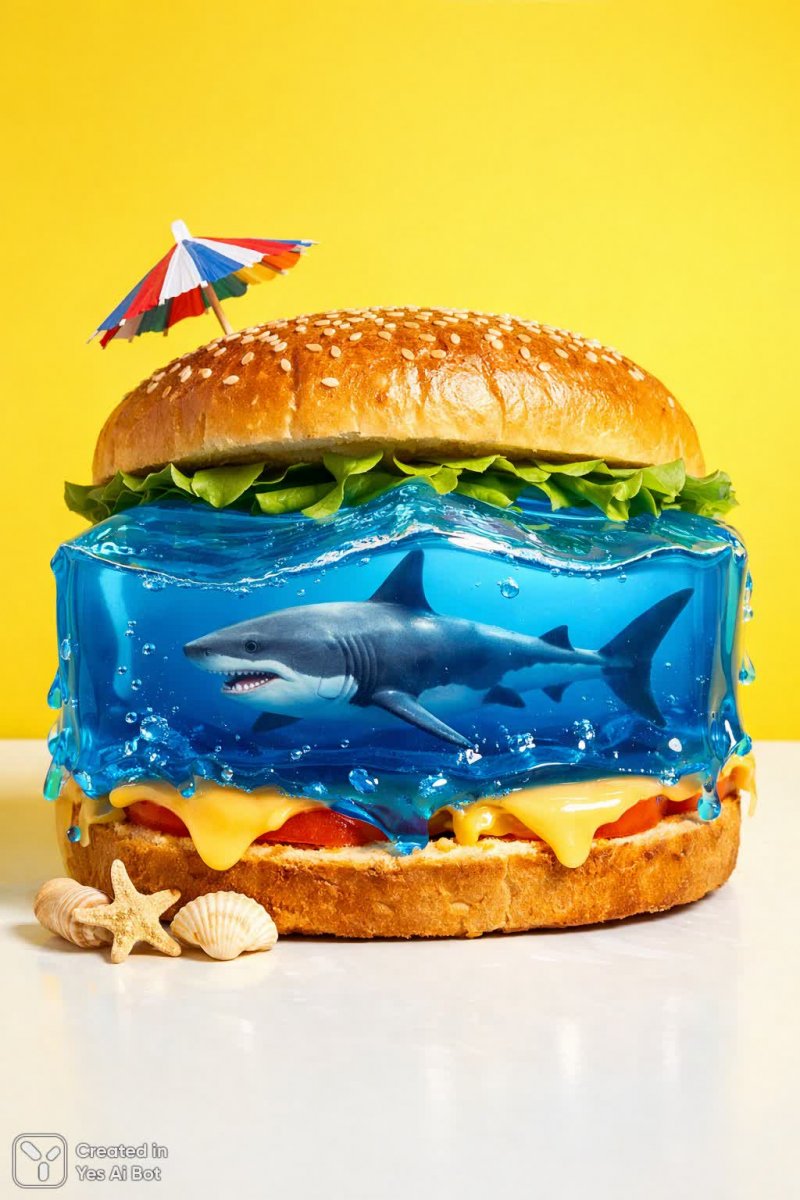 Невероятный сюрреалистичный сэндвич предстает перед нами как волшебное видение – это не просто перекус, а целая вселенная в миниатюре. Представьте себе безмятежное голубое желеобразное море, сверкающее под лучами солнца, и в его глубинах грациозно скользит акула, будто бы обитатель далекого фантастического океана. Яркий желтый фон подчеркивает необычность этой композиции, добавляя ей игривости и динамизма. Каждый элемент тщательно проработан с высокой детализацией, от плавных линий до текстуры желе и чешуи акулы. Это произведение искусства, где воображение встречается с кулинарным мастерством. Мягкое освещение создает ощущение легкости и воздушности, а чистые линии подчеркивают геометрическую точность и продуманность каждой детали. Этот образ – воплощение творческого подхода к обычному предмету, способное вызвать улыбку и заставить задуматься о бесконечных возможностях воображения. Это не просто сэндвич, это портал в мир фантазий, где реальность смешивается с мечтой, а обыденные вещи обретают необыкновенный смысл. Он словно приглашает нас окунуться в этот яркий и красочный мир, полный сюрпризов и неожиданных открытий. Это визуальный шедевр, который запечатлевает момент волшебства и вдохновения