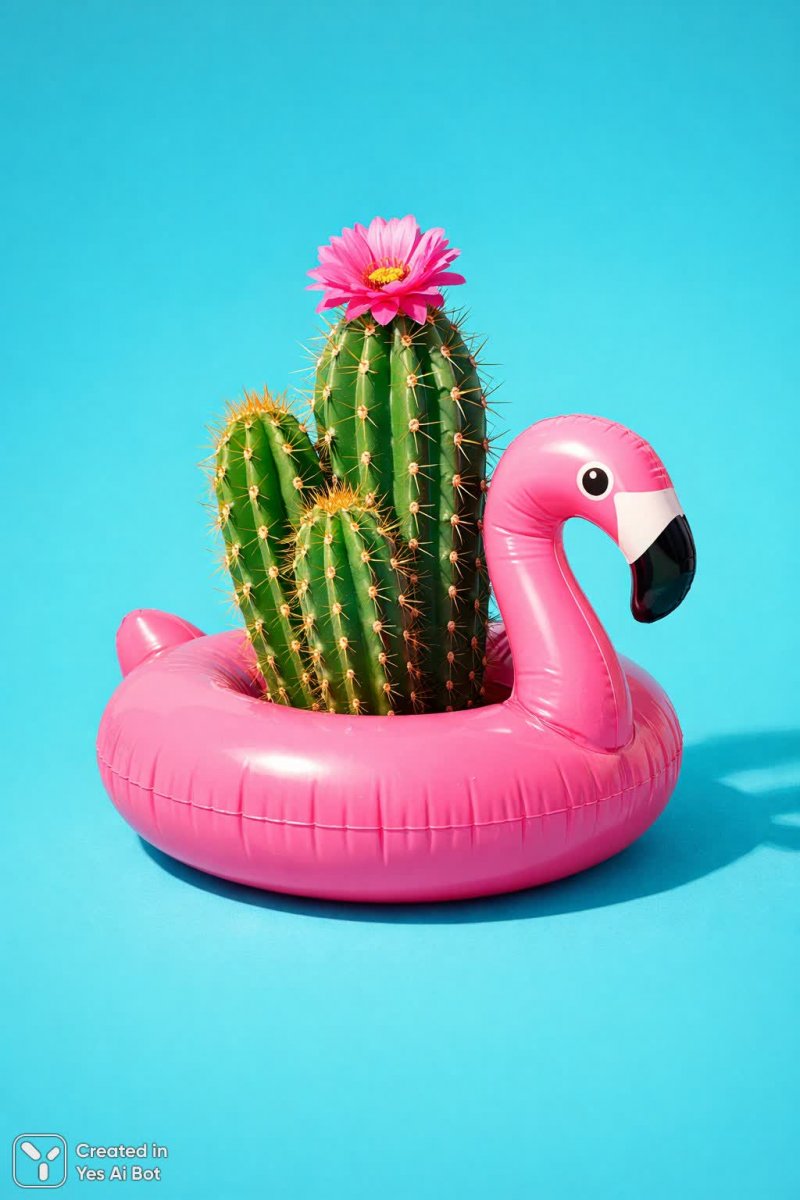 5. a vibrant cactus with pink flamingo floatie, displayed against a clean turquoise background, surreal composition, playful and imaginative style, bright colors, soft shadows, minimalist design.