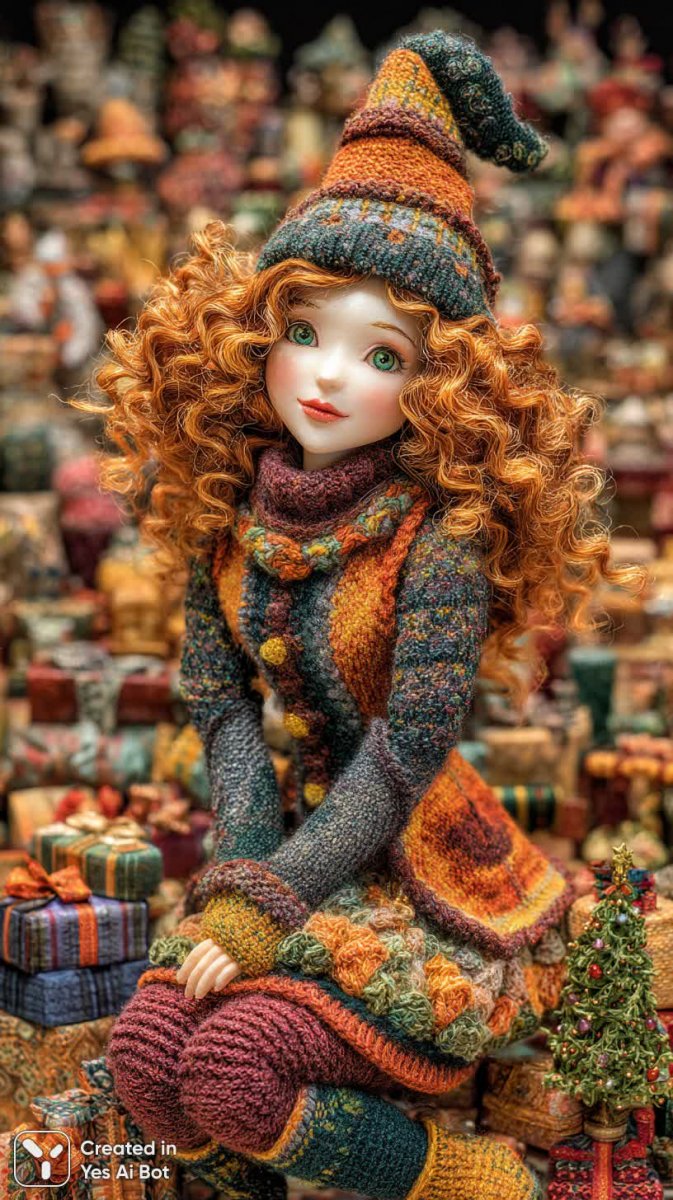 Милая вязаная кукла с пушистыми ало-рыжими волосами и округлым личиком излучает очарование и праздничное настроение. Она одета в восхитительный эльфийский костюм, включающий остроконечную шапочку и полосатые колготки, что придает ей сказочный вид. Кукла гордо стоит рядом с горой ярких разноцветных подарков, а в ее больших глазах читается неподдельный восторг и предвкушение праздника. Фоном для этой волшебной сцены служит уютная рождественская мастерская, наполненная атмосферой творчества и подготовки к новогодним чудесам. Виднеются инструменты для рукоделия, сверкающие гирлянды и другие элементы декора, создающие ощущение тепла и сказки. Кажется, будто эта кукла – настоящий эльф-помощник Деда Мороза, готовый доставить радость каждому ребенку. Вся композиция пронизана духом добра, волшебства и праздника. Она вызывает теплые воспоминания о детстве, о чудесных подарках и ожидании новогоднего чуда. Невозможно не улыбнуться, глядя на эту очаровательную куклу в ее сказочном костюме, окруженную яркими подарками и наполненную радостью предвкушения праздника. Это идеальный символ волшебства и беззаботности, который подарит хорошее настроение и зарядит позитивом