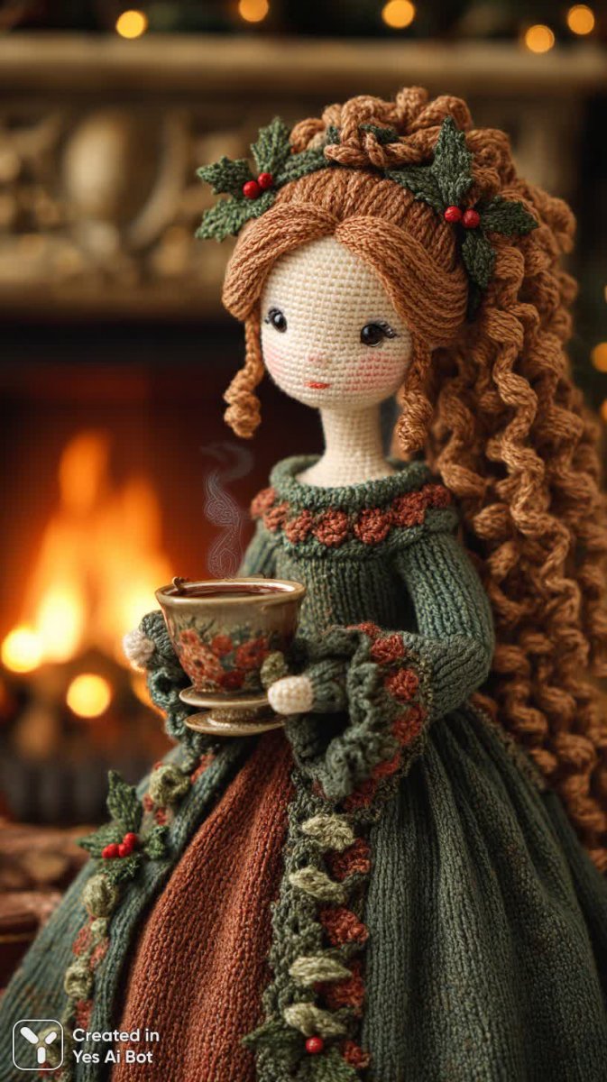 crocheted doll with long golden hair and rosy cheeks, wearing a Christmas-themed dress with holly patterns, holding a cup of hot cocoa, standing by a fireplace with stockings hung, warm and inviting atmosphere, BG is cozy and cheerful.
