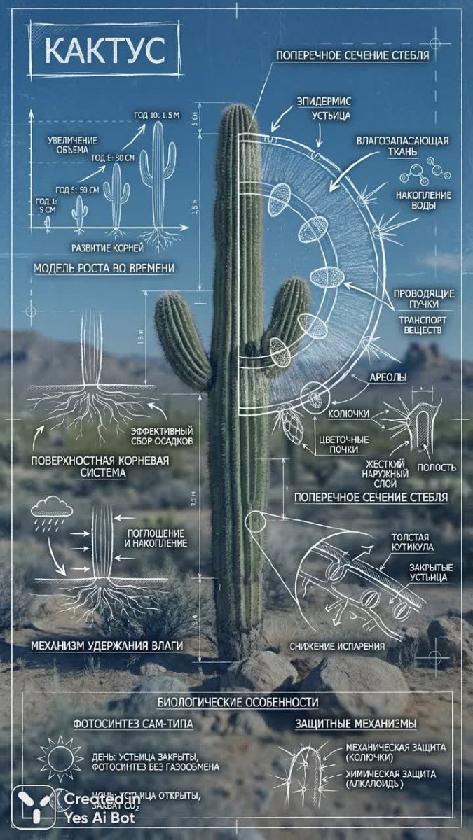 Анатомия кактуса: чертежи, схемы и биологические особенности в русском стиле - Генерация в нейросети Nano Banana