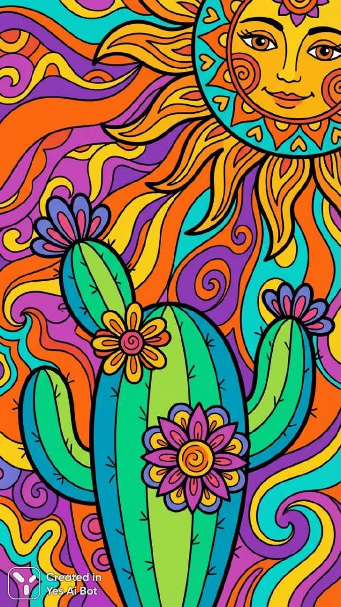 colorful abstract background, large cactus, vibrant swirling patterns, bold black outlines, bright sun with decorative elements, cartoonish style, playful atmosphere, rich colors.