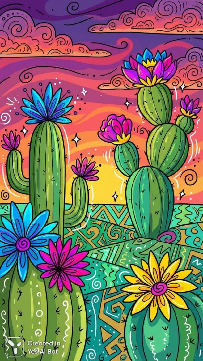 bright cacti under a vivid sunset, abstract patterns, cartoon style, large flowers, contrasting colors, decorative elements, playful doodle art, rich purple and orange tones, joyful atmosphere.
