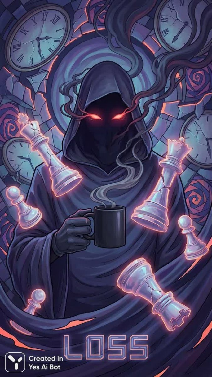 Тёмный вампир с шахматными фигурами и чашкой кофе символизирует утрату - Картинка, сгенерированная нейросетью NanoBanana