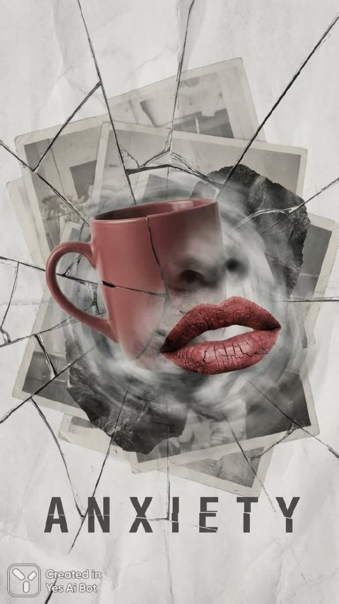 2. an abstract composition displaying fractured memories through a broken lines pattern, where a matte red cup and red lips merge with shifting realities, set against a monochromatic background and featuring the text: "A N X I E T Y"