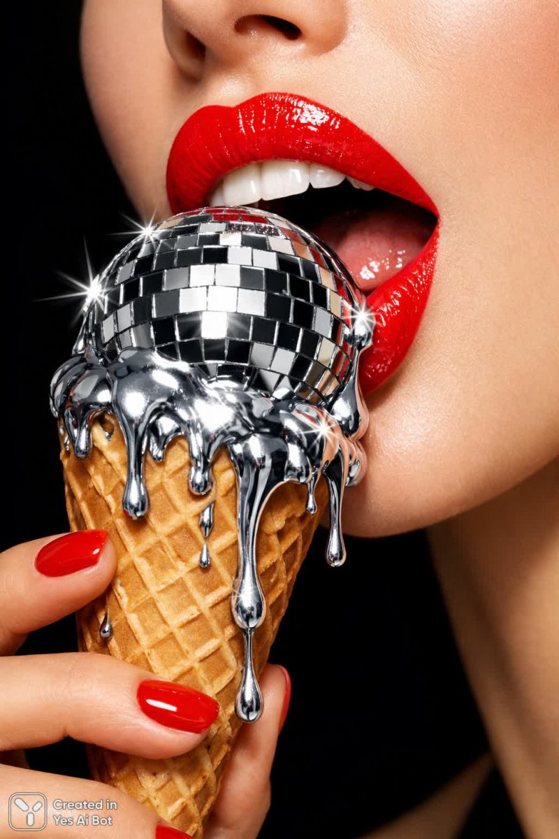 Изысканный портрет, где в центре внимания – чувственные губы женщины, украшенные ярко-красной помадой. Её прикосновение к вафельному рожку становится акцентом, открывая зрителю нечто большее, чем просто десерт. Рожок наполнен хромированным великолепием, а внутри – тающее мороженое в виде диско-шара, переливающееся всеми цветами света и отражающее атмосферу ночного клуба. Каждый элемент изображения проработан до мельчайших деталей, создавая ощущение реальности и при этом добавляя сюрреалистический оттенок. Темный фон подчеркивает яркость помады и блеск мороженого, усиливая визуальное воздействие. Это не просто фотография, а метафора желания, соблазна и мимолетности момента, запечатленная в ярких цветах и неожиданном сочетании текстур. Вся композиция словно рассказывает историю о страсти, удовольствии и уходящей красоте, оставляя после себя ощущение загадочности и притягательности. Изображение обладает сильной визуальной энергией, благодаря чему оно способно захватить внимание зрителя с первого взгляда и надолго остаться в памяти. Это современное искусство, сочетающее в себе элементы моды, гастрономии и фантазии