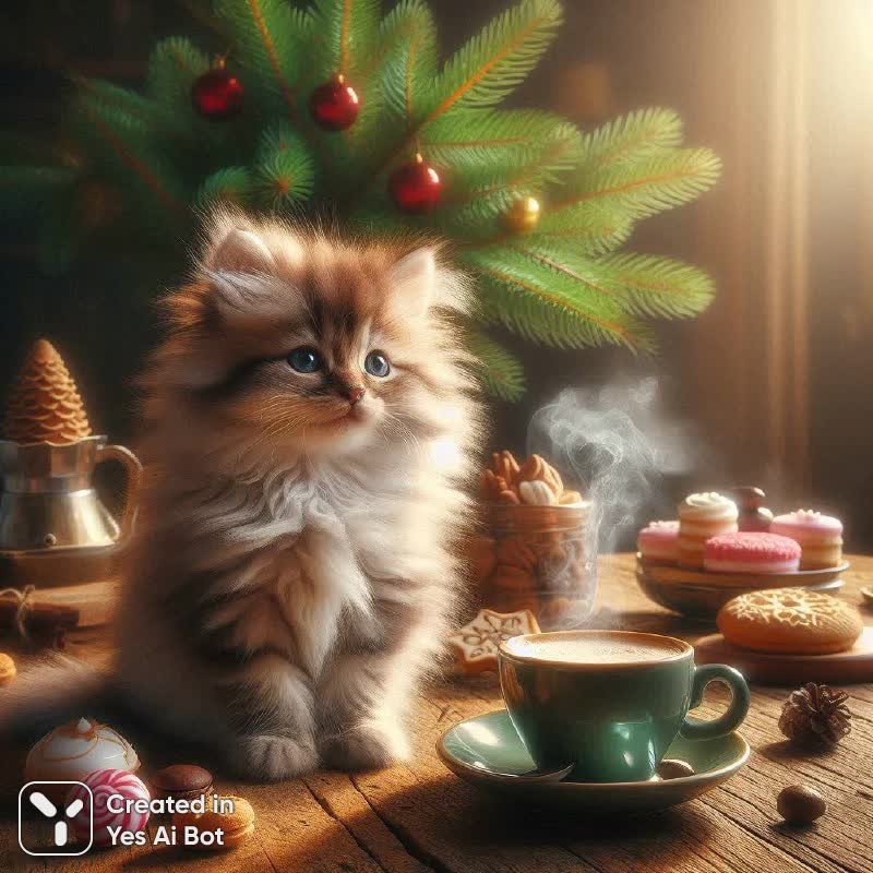 Теплое утро в объятиях домашнего уюта. Маленький пушистый котенок, словно сошедший с рождественской открытки, удобно расположился на столе, рядом с ароматной чашкой дымящегося кофе. Вокруг царит атмосфера неспешного начала дня, наполненная мягким светом и ощущением покоя. На столе разложены сладости – аппетитные конфеты и хрустящее печенье, словно приглашая насладиться моментами тишины и безмятежности. В вазе красуются свежие ветки ели, добавляя в интерьер нотку зимней сказки и праздничного настроения. Картина пропитана спокойствием и гармонией, создавая идеальный фон для утреннего чаепития или просто созерцания красоты момента. Это сценарий уюта, где время замедляет свой ход, а сердце наполняется теплом и радостью от простых вещей. Забудьте о суете внешнего мира и погрузитесь в этот островок спокойствия, где правят котики, кофе и сладости. Здесь можно забыть обо всех заботах и просто наслаждаться каждым мгновением этого прекрасного утра. Этот маленький уголок тепла и уюта – настоящий бальзам для души, способный подарить ощущение счастья и гармонии с собой и окружающим миром