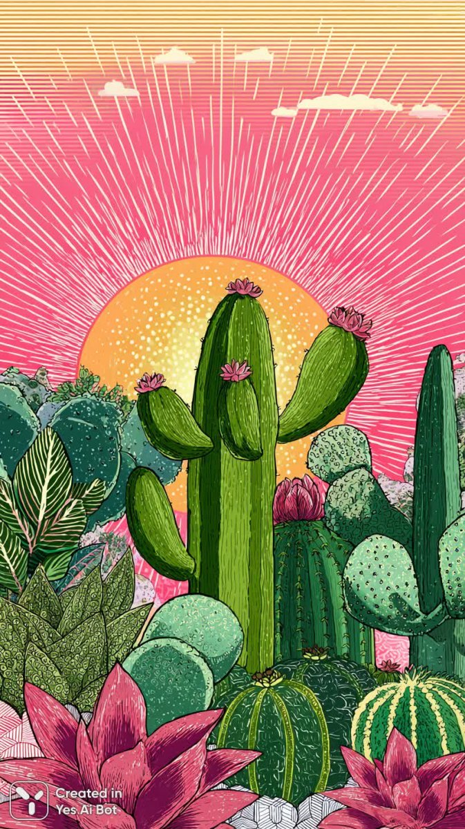 Яркий и сюрреалистичный фон, словно сошедший с полотна безумного художника. В центре композиции – россыпь ярких кактусов, оживлённо выделяющихся на фоне абстрактной палитры. Солнце, представленное в виде геометрического узора, излучает энергию и наполняет изображение жизнерадостностью. Цветовая гамма поражает воображение: психоделическое сочетание оттенков создаёт ощущение полного погружения в мир фантазий. Стиль рисунка – наивный, doodle-стиль, добавляющий картине лёгкости и игривости. Преобладают насыщенные зелёные и розовые тона, гармонично дополняющие друг друга и создающие визуальный баланс. Декоративные элементы, будто бы случайно разбросанные по всей поверхности, придают изображению уникальность и неповторимость. В целом, работа выполнена в мультяшной манере, что делает её привлекательной для широкой аудитории и вызывает положительные эмоции. Это настоящее произведение цифрового искусства, сочетающее в себе элементы абстракции, сюрреализма и наивного рисунка, создавая яркий и запоминающийся визуальный образ. Кажется, будто попал внутрь красочного сна, где реальность переплетается с фантазией, а каждый элемент несет в себе заряд позитива и вдохновения. Этот фон станет отличным дополнением для любого проекта, требующего креативного и оригинального решения