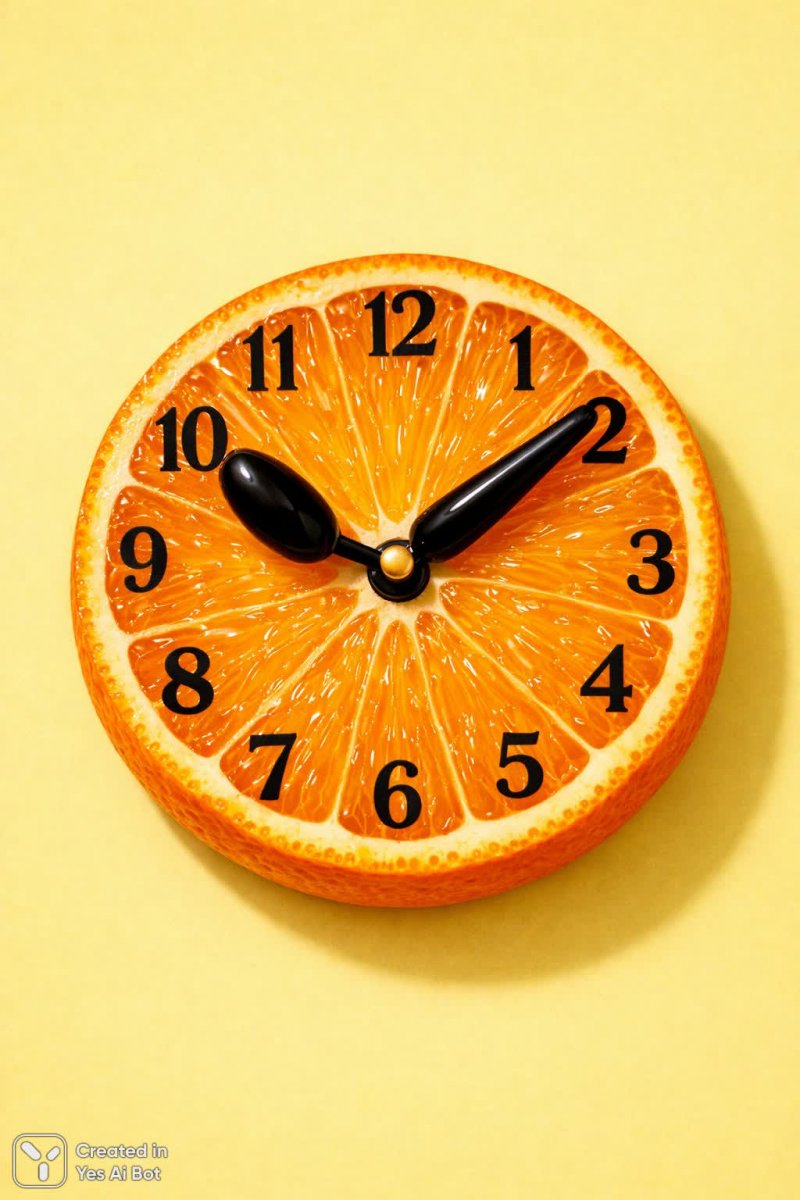 sora Апельсиновое время: сюрреалистичный циферблат с оливковыми стрелками и ярким фоном. Генерация из нейронной сети Sora Image
