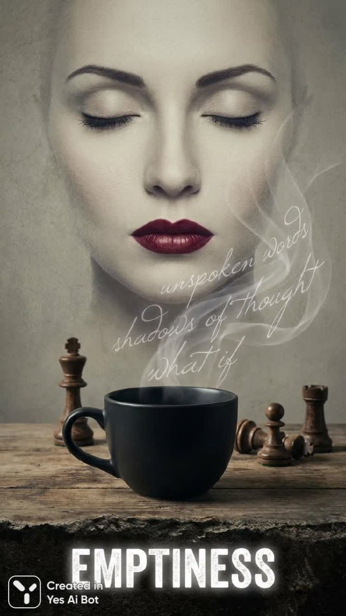 an intriguing piece depicts a serene face with red lips, a matte black coffee cup, and ghostly whispers surrounding the figure, enhanced by chess pieces that symbolize strategic duality, creating a feeling of unreachable warmth; text: "EMPTINESS"