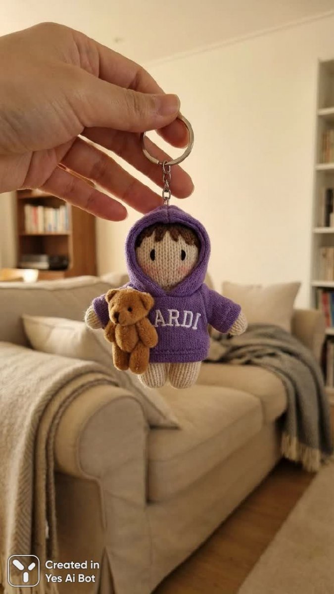 A photorealistic portrayal of a hand holding an adorable keychain of a plush doll: wearing a purple outfit with “ARDI”, holding a tiny teddy bear, with a backdrop of a cozy bedroom.