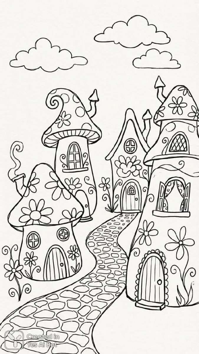 Очаровательные домики: черно-белая иллюстрация в детском стиле. Нейросеть Nano Banana