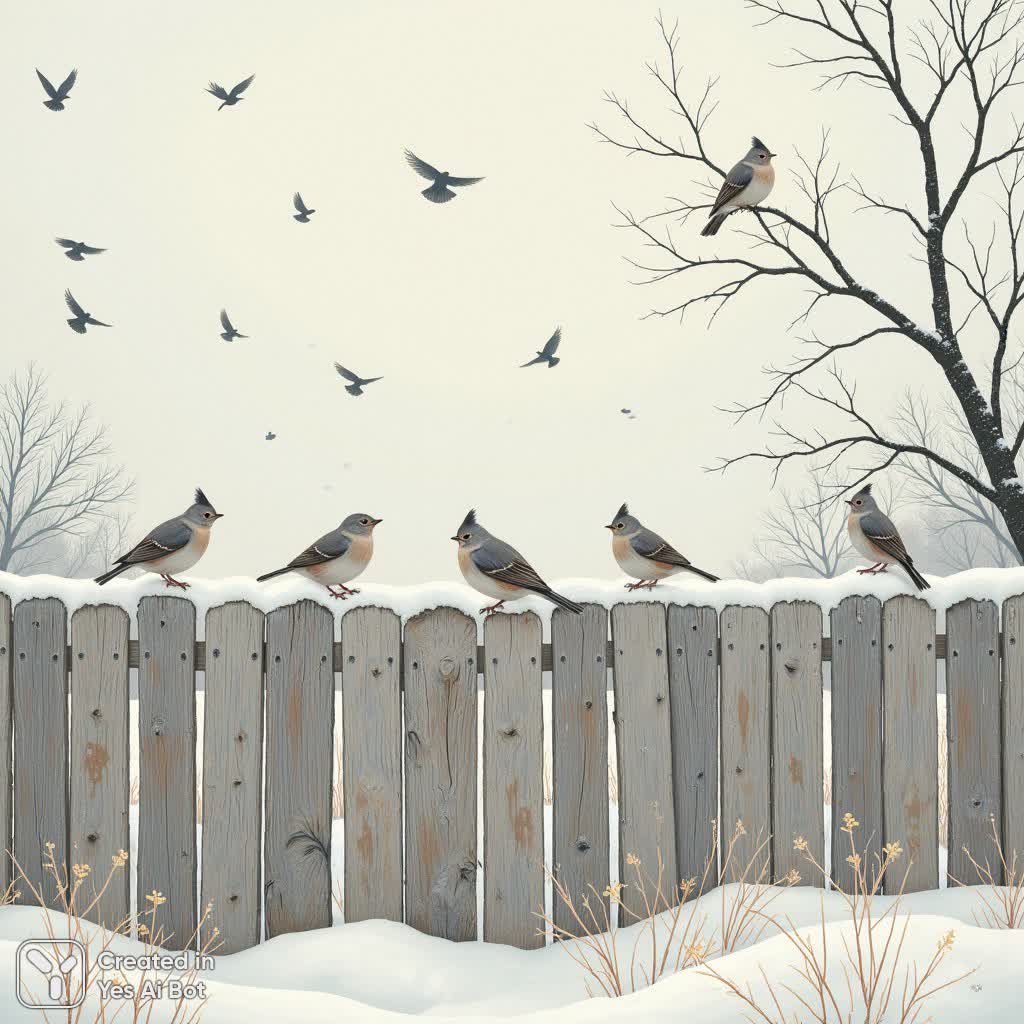 A winter landscape, a wooden fence covered with a thick layer of fresh white snow, serving as a refuge for several small birds. Six birds are the main subject, mostly gray-brown in color, with fine hatching to indicate feathers and form. One bird sits on a snow-covered tree branch in the background. Several silhouettes of birds are depicted in the sky, seemingly flying or moving in the winter environment. The background is soft, muted, and pale white, reminiscent of snow. The fence consists of weathered wooden planks with a distinct wood texture. The scene evokes a feeling of a gentle, peaceful atmosphere, perhaps with a hint of melancholy. T...