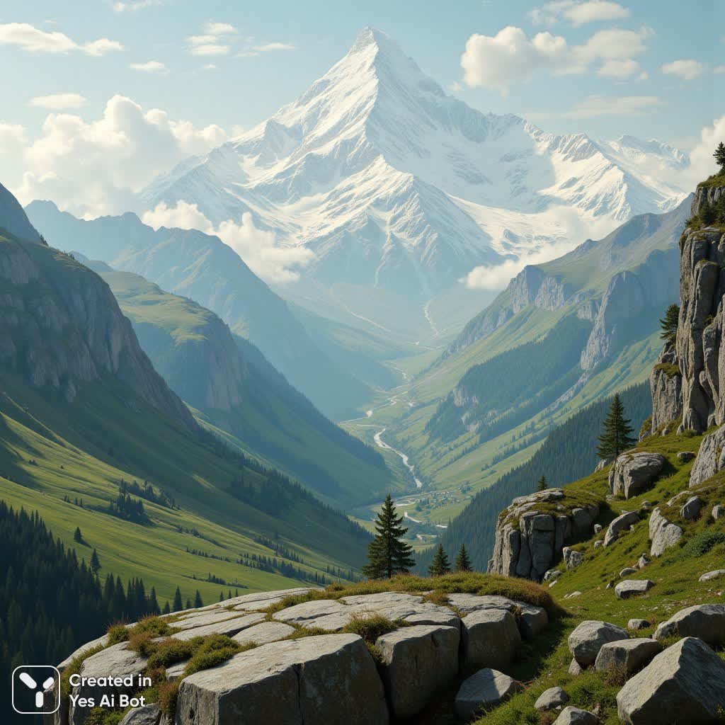 Величественное полотно эпохи романтизма, пленяющее воображение безграничной красотой дикой природы. В глубине картины возвышается заснеженная горная цепь, чьи пики, окрашенные в оттенки белого и нежно-голубого, словно парят в мягком, призрачном тумане, окутывающем их ореолом таинственности и недоступности. Эта дымка создает ощущение отдаленности от мира и приглашает зрителя к созерцанию первозданной красоты. Передний план картины занимает композиция из крупных, неровных скальных образований, покрытых изумрудным мхом и серой лишайником, создавая резкий контраст с более мягким и зеленым ландшафтом в среднем плане. Склоны холмов и долин плавно ниспадают вниз, укрытые пышной растительностью и участками скальных выходов. Разбросанные по всей сцене небольшие деревья добавляют темные зеленые акценты, подчеркивая разнообразие текстур и форм. Цветовая гамма картины преобладает холодными оттенками зеленого, синего и белого, дополненных землистыми коричневыми и серыми тонами. Мягкое, рассеянное освещение создает спокойную и созерцательную атмосферу, располагающую к размышлениям о вечном величии природы. Широкоугольная перспектива подчеркивает необъятность и грандиозность окружающего пейзажа, передавая чувство благоговения и восхищения, характерное для творчества Каспара Давида Фридриха – мастера романтического искусства. Картина словно шепчет о силе и красоте нетронутой природы, призывая зрителя ощутить ее величие и гармонию