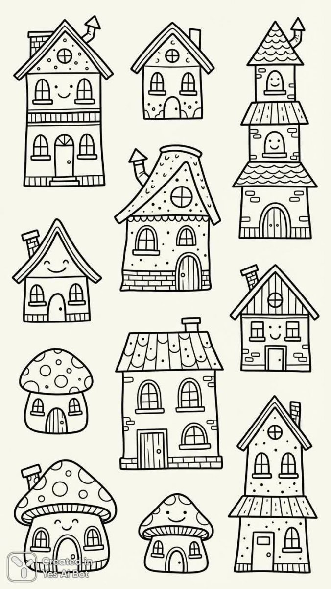 set of unique doodle-style houses, hand-drawn black and white, cartoonish features, simple illustrations, various sizes and shapes, minimal background, fun and charming design, perfect for kids' coloring book.