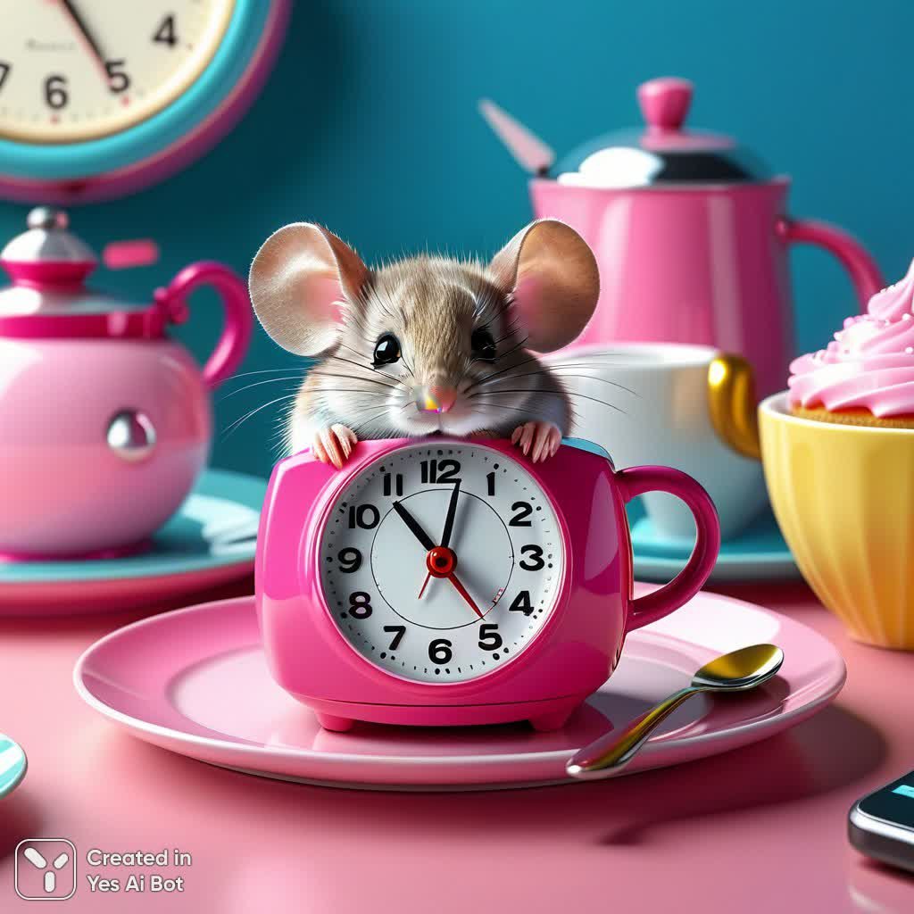 Уютное утро маленького мышонка: пушистый комочек сладко спит, прижавшись к будильнику, словно в объятиях. Рядом – чашка ароматного розового кофе, а на тарелке красуется аппетитный прямоугольный торт с нежным кремом. Кажется, что время замерло в этом волшебном уголке, наполненном теплом и безмятежностью. Крупный план передает мельчайшие детали: мягкость шерстки, текстуру глазури, блеск металла будильника. Гиперреалистичная картинка создает ощущение полного погружения, словно можно почувствовать тепло от чашки кофе и нежность прикосновения к пушистой спинке мышонка. Объемный трехмерный дизайн добавляет глубины и реалистичности изображению, а зеркальное отражение усиливает эффект присутствия. Высокая детализация позволяет рассмотреть каждую ворсинку шерстки, каждый завиток крема на торте, каждое мельчайшее деталь будильника, создавая поистине завораживающее зрелище. Эта картина – воплощение уюта, тепла и безграничного очарования маленького мышонка, наслаждающегося своим сладким утренним сном. Это идеальное сочетание милоты и эстетики, способное вызвать улыбку и ощущение спокойствия