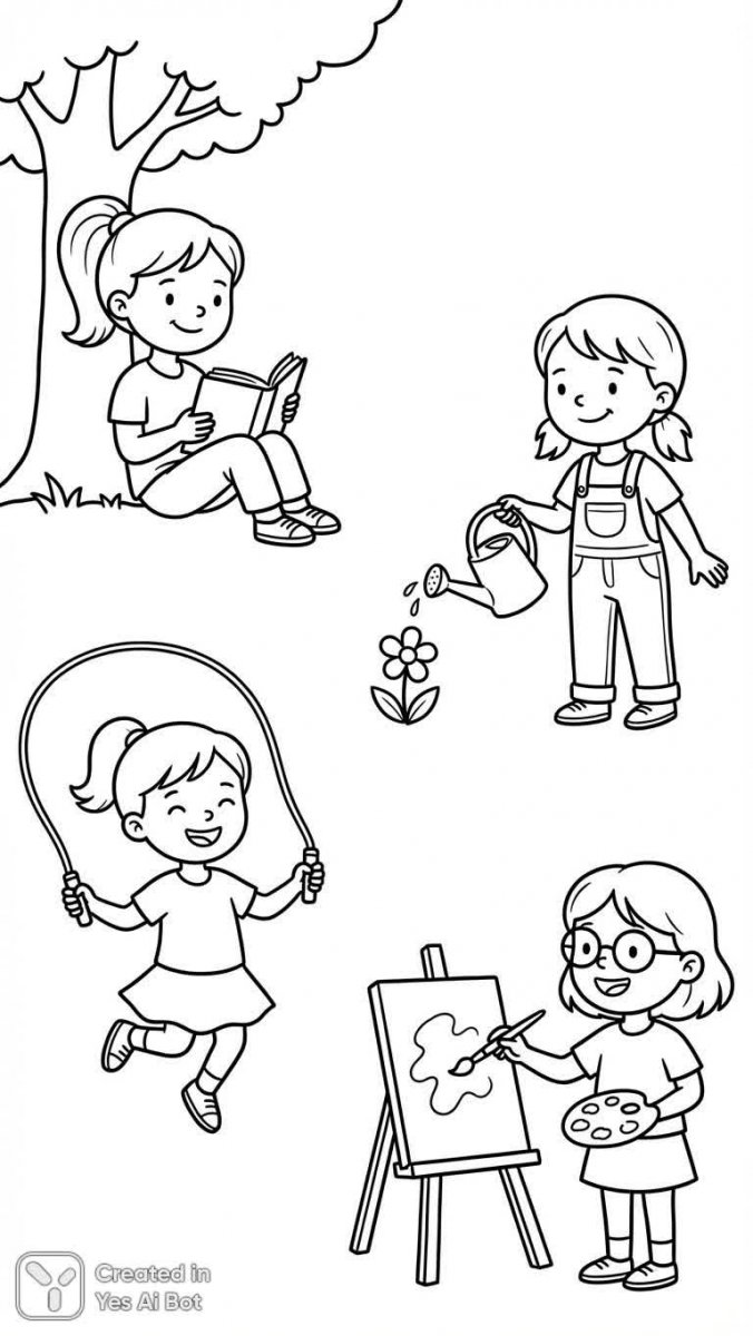 Милые девочки, запечатленные в повседневных радостях и занятиях, оживают на бумаге благодаря изящным черно-белым контурным иллюстрациям. Каждая деталь прорисована с любовью, от простых линий одежды до очаровательных выражений лиц, излучающих искреннюю радость и беззаботность. Этот сборник рисунков идеально подходит для детских раскрасок, предлагая малышам возможность раскрыть свой творческий потенциал и добавить ярких красок в эти нежные образы. Изображения выполнены в минималистичном стиле, с четким белым фоном, что позволяет сосредоточиться на деталях рисунка и создавать ощущение легкости и воздушности. Одежда персонажей отличается милыми и привлекательными стилями, подчеркивающими их юный возраст и безмятежное настроение. Вся композиция пронизана дружелюбной атмосферой, располагающей к улыбке и создающей позитивное впечатление. Это прекрасный выбор для оформления детских товаров, учебных материалов или просто для тех, кто ценит красоту простых вещей и искреннюю радость в глазах детей. Иллюстрации излучают тепло и уют, приглашая зрителя окунуться в мир детства и воображения. Они словно шепчут о безграничных возможностях творчества и дарят ощущение спокойствия и гармонии