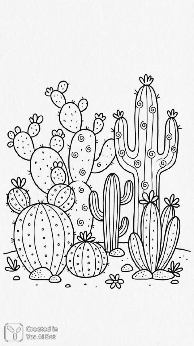 Черно-белые кактусы в стиле дудла: причудливые очертания и забавные формы для раскрашивания - Пример изображения из нейросети NanoBanana