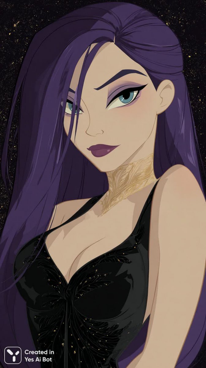 Очаровательная девушка-вампир в дерзком и соблазнительном образе пленяет взгляд своей неземной красотой. Ее длинные фиолетовые волосы струятся вокруг лица, подчеркивая безупречную гладкость кожи, словно покрытую атласом. Яркий макияж глаз акцентирует глубину взгляда, полного игривости и таинственности. На ней – элегантное черное кожаное платье, дополненное роскошными золотыми украшениями, которые добавляют образу нотку аристократизма и силы. Смелые контуры рисунка усиливают выразительность каждого элемента, создавая эффектный и запоминающийся визуальный образ. Вся композиция пронизана волшебным светом, который придает девушке нереальность и загадочность, словно она сошла со страниц фэнтезийного романа или ожила на экране аниме. Ее взгляд завораживает, обещая захватывающие приключения и скрытые тайны. Это воплощение темной элегантности и пленительной красоты, сочетающее в себе силу вампира и утонченность аниме-героини. Идеальное сочетание дерзости и нежности, созданное для тех, кто ценит уникальность и яркие эмоции. Она – воплощение мечты о сказочном существе, способном покорить любое сердце своей неповторимой харизмой