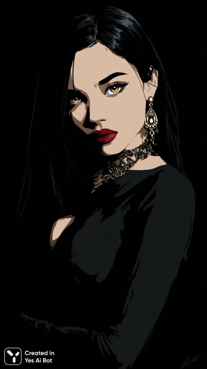 Завораживающая цифровая иллюстрация демонстрирует образ загадочной и сильной женщины, пленяющей своей мрачной красотой. Её длинные черные волосы эффектно обрамляют лицо с пронзительным взглядом желтых глаз – акцент, усиливающий ощущение таинственности и внутренней силы. На губах – яркий алый помада, создающая контраст с общей готической атмосферой и подчеркивающая чувственность образа. Идеально сидящее черное платье обрисовывает силуэт фигуры, добавляя элегантности и графичности. Сложные украшения завершают ансамбль, привнося нотку роскоши и символизма. Драматическое освещение акцентирует внимание на ключевых деталях – выразительных глазах и чувственных губах, создавая эффект глубокого погружения в мир фантазий и готической эстетики. Картина излучает ауру власти и загадочности, представляя собой тщательно продуманный портрет современной готической дивы. Работа выполнена с невероятной детализацией, демонстрируя мастерство цифрового художника и его умение передать сложные эмоции и визуальные образы. Это не просто иллюстрация – это погружение в мир темных грез и утонченной красоты, где каждый элемент работает на создание неповторимого и запоминающегося образа. Изображение излучает уверенность и независимость, воплощая собой идеал сильной и загадочной женщины