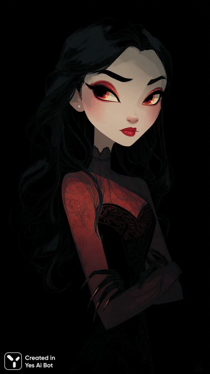 Загадочный портрет юной красавицы с ниспадающими черными локонами, взгляд которой приковывает внимание. Яркий макияж в красно-желтых тонах подчеркивает выразительность ее глаз, а длинные острые черные ногти добавляют образу нотку дерзости и загадочности. На ней обтягивающий черный корсет с готическими элементами, который акцентирует изящную фигуру и придает портрету драматизм. Поза модели – завораживающая, манящая, словно приглашающая зрителя в мир тайн и страстей. Мягкое освещение создает атмосферу романтики и загадочности, подчеркивая красоту и нежность черт лица. Вся композиция пронизана образом прекрасной вампирши – роковой женщины с неповторимым шармом и магнетической притягательностью. Четкие линии и контуры придают портрету графичность и завершенность, делая его по-настоящему запоминающимся произведением искусства. Это не просто изображение девушки, это воплощение мистики, красоты и силы женского духа. Портрет излучает ауру таинственности и соблазна, оставляя неизгладимое впечатление в памяти зрителя. Он словно запечатлел момент между реальностью и фантазией, приглашая задуматься о природе красоты и загадках человеческой души