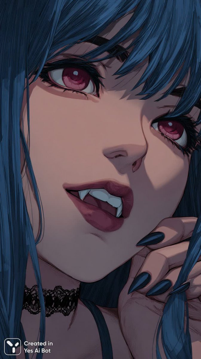 Завораживающий портрет в стиле аниме и мультфильма демонстрирует очаровательную вампиршу с длинными небесно-голубыми волосами, ниспадающими волнами, подчеркивающими ее неземную красоту. Ее острые когти, словно ледяные осколки, намекают на скрытую силу и хищный нрав. Пронзительные красные глаза, полные таинственности и магнетизма, приковывают взгляд, а едва заметные клыки выдают ее истинную сущность. Атмосфера вокруг нее окутана элегантной тьмой, создавая ощущение роскоши и опасности одновременно. На губах застыла милая улыбка, смягчающая ее вампирский облик и придающая образу неповторимую прелесть. Цифровая иллюстрация отличается четкими контурами, характерными для мультфильмов, что придает изображению динамичность и выразительность. Вся композиция пронизана духом сказочности и фантазии, представляя собой яркий пример сочетания милой внешности и темной тематики, присущей жанру аниме. Это портрет юной красавицы, скрывающей за своей очаровательной улыбкой тайны ночи, воплощение грации и загадочности в мире мультфильмов. Ее образ запоминается своей контрастностью и притягательностью, оставляя неизгладимое впечатление на зрителя