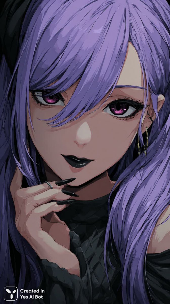 cartoon anime girl with long purple hair, sharp nails, edgy black clothing, captivating smile, piercing red eyes, fangs, gothic atmosphere, art style with bold outlines, vivid details, anime digital art.