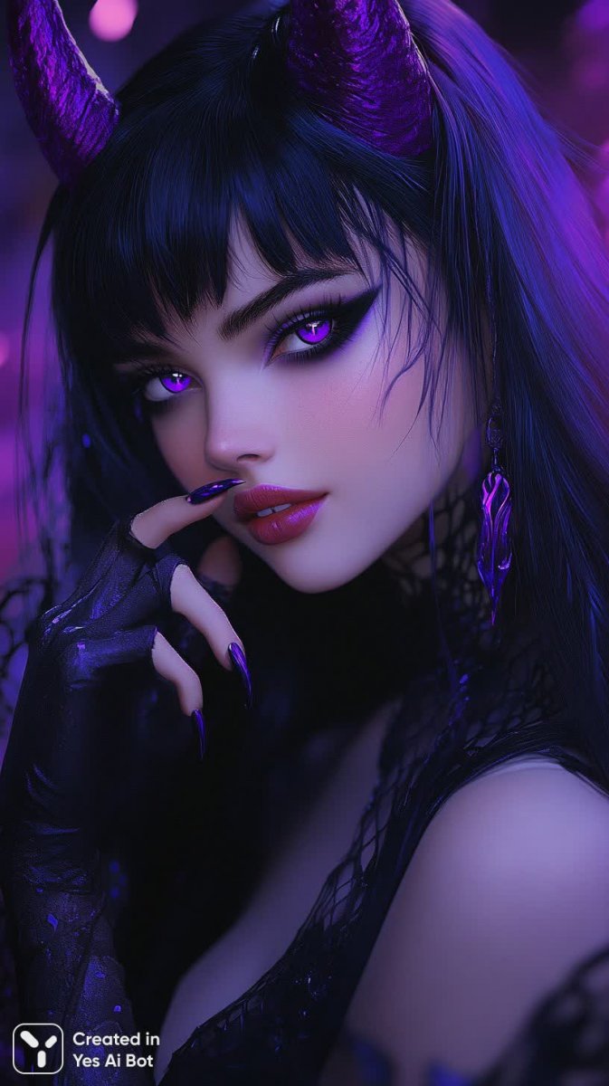 Завораживающий портрет молодой вампирессы в стиле аниме, пленяющий своей дерзостью и притягательностью. Её длинные фиолетовые рога придают образу загадочности и силы, а тёмный макияж подчеркивает острые черты лица и выразительные красные глаза, пронзающие взгляд. Уверенная мина и еле заметная улыбка выдают её властную натуру. Очаровательная вампирша облачена в элегантное чёрное платье, идеально сочетающееся с бледной кожей и острыми когтями. Эта яркая цифровая иллюстрация демонстрирует красоту и опасность одновременно, воплощая собой образ роковой красавицы из мира аниме. Чёткие контуры придают рисунку динамичность и выразительность, делая его по-настоящему запоминающимся произведением цифрового искусства. Взгляд прикован к этой невероятно красивой вампирессе, сочетающей в себе нежность и смертельную грацию, что делает её идеальным персонажем для фэнтезийной истории или захватывающего аниме-проекта. Она – воплощение темной элегантности и таинственной силы