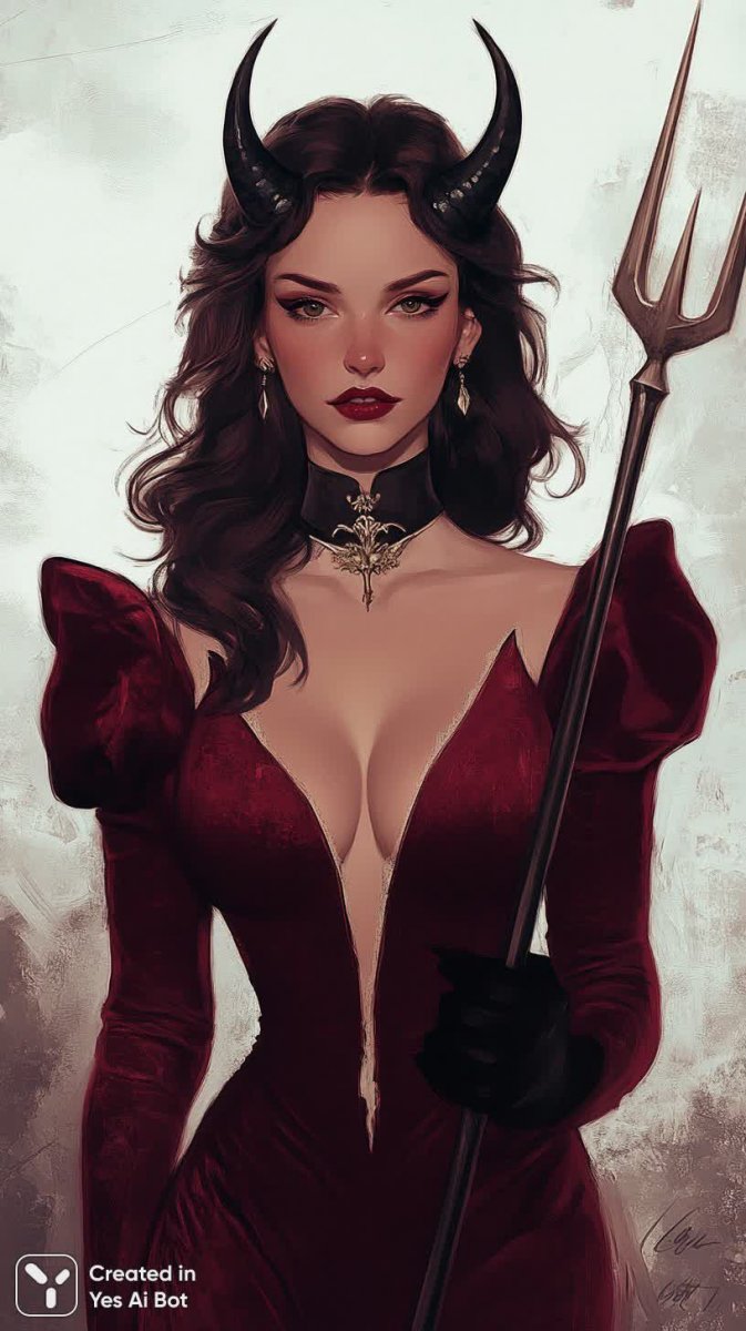 Загадочная и дерзкая особа в образе дьяволицы предстает перед нами во всем своем великолепии. Яркое красное платье с длинными рукавами подчеркивает ее соблазнительную фигуру, а пышные кудри добавляют образу игривости и кокетства. Солнцезащитные очки с рожками придают ей загадочности и намекают на скрытую силу. В одной руке она уверенно держит вилку – символ власти и искушения, а вторая рука покоится на бедре в жесте непринужденной элегантности. Фон выдержан в белоснежном цвете, что позволяет полностью сосредоточиться на яркой и выразительной фигуре дьяволицы. Стиль изображения напоминает мультфильм – лаконичный, минималистичный и полный энергии. Каждый элемент композиции тщательно продуман для создания запоминающегося образа, который сочетает в себе элементы соблазна, юмора и загадочности. Это не просто женщина в костюме дьявола, это воплощение мифологического персонажа с яркой индивидуальностью и неповторимым шармом. Она словно сошла со страниц сказочной истории или ожила на страницах комикса, притягивая внимание своей дерзкой красотой и уверенностью в себе. Ее взгляд полон вызова и загадочности, а поза выражает полную свободу и независимость