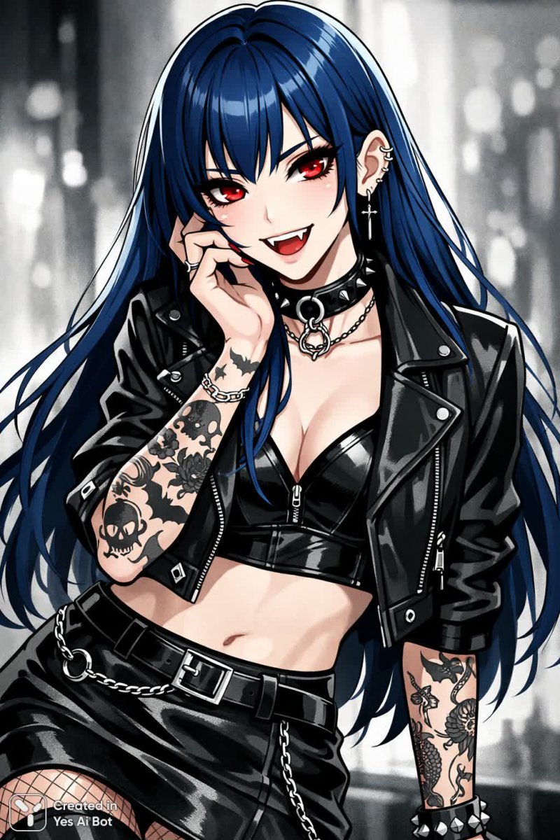 cartoon anime girl, vampire girl with long blue hair and pale skin, expressive gaze, edgy black clothing, piercing red eyes, sharp fangs, smile, tattoos on arms, digital art, bold outlines, stylish atmosphere.