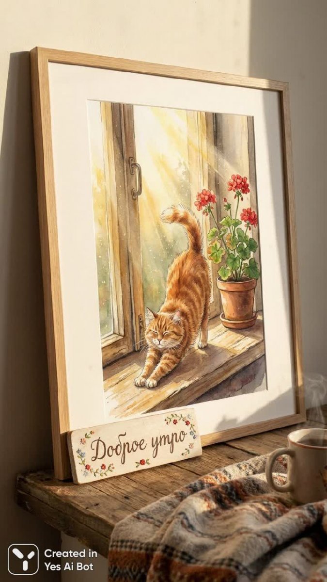Утреннее изображение кота, сладко потягивающегося на подоконнике, залитом солнечным светом. Работа выполнена в мультяшном стиле с высокой степенью фотореализма, создавая ощущение непосредственного присутствия рядом с животным. Яркая цветовая палитра передает атмосферу позитива и тепла, а надпись 'доброе утро' на русском языке, украшенная цветочными мотивами, добавляет уюта и душевности. Композиция построена под углом, что придает динамику. Изображение детализировано благодаря использованию DSLR-камеры с объективом 50 мм, позволяющим передать текстуру шерсти и подоконника, а также игру света. Картина создает ощущение спокойствия и гармонии, идеально подходит для начала дня с улыбкой и напоминает о простых радостях жизни. Работа создана нейросетью Nano Banana v.1.0 Pro по запросу, включавшему описание милого нарисованного кота, солнечного света, цветов, надписи 'доброе утро' на русском языке, ярких цветов, фона, фотореализма, вида сбоку и использования DSLR-камеры с объективом 50 мм.