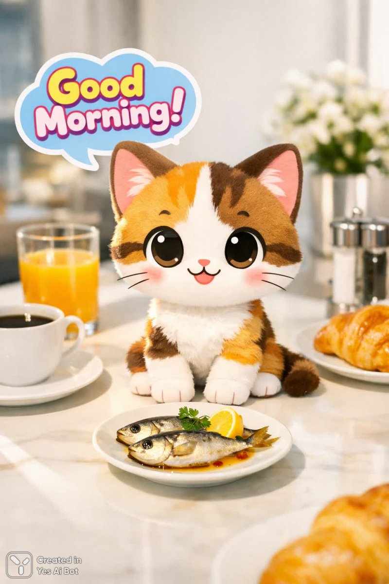 adorable cartoon kitten, sitting on a breakfast table, small plate of fish, "good morning" text in a playful bubble, bright colors, minimalism, BG, photorealism, eye-level shot, classic camera, 35mm lens.