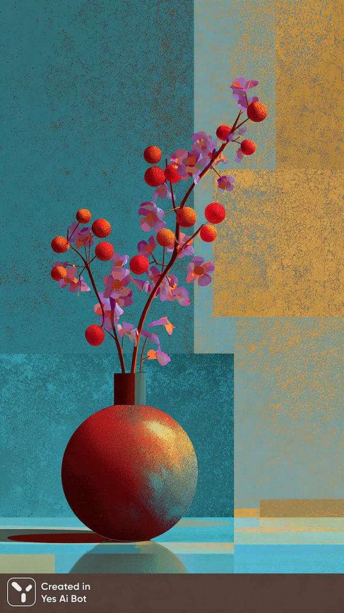 Яркая абстрактная картина представляет собой округлый красный вазон, расположенный на полосатой поверхности. Ваза наполнена нежными цветами в пастельных тонах, композиция которых выстроена с учетом глубины и перспективы. Фон динамично меняется между мягкими оттенками голубого и желтого, создавая ощущение легкости и воздушности. В изображении присутствуют геометрические формы, которые добавляют современную стилизацию и подчеркивают графическую природу произведения. Картина выполнена в формате png, что позволяет сохранить все детали и нюансы цветовой палитры, обеспечивая высокое качество изображения. Этот визуальный шедевр сочетает в себе элементы абстракции, декоративного искусства и современного дизайна, создавая гармоничное и привлекательное произведение, способное украсить любое пространство и стать источником вдохновения. Композиция продумана до мелочей, каждый элемент играет свою роль в создании общего впечатления от картины