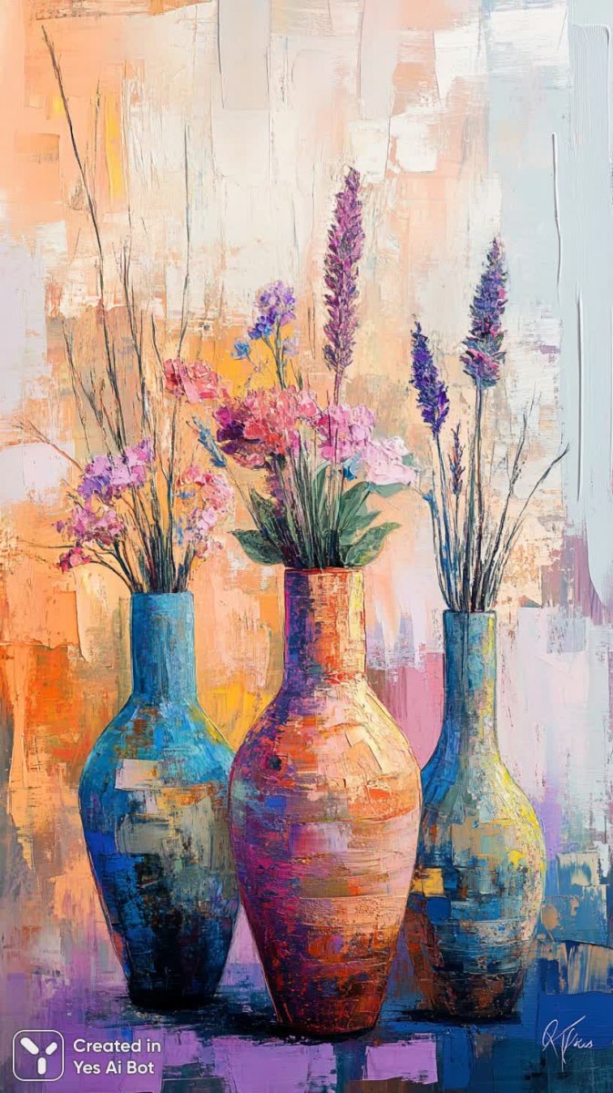 Яркая абстрактная композиция с тремя вазами завораживает плавными линиями и геометрическими формами. В центре внимания – крупный оранжевый сосуд, словно излучающий тепло и энергию. Нежные пастельные цветы, изящно расставленные в вазах, создают атмосферу спокойствия и утонченности. Фон выполнен в минималистичном стиле с мягкими градиентами розового и голубого цветов, подчеркивающими красоту центральных элементов. Стиль стилизации придает работе глубину и объемность, создавая ощущение трехмерного пространства. Это изысканное векторное произведение искусства, представленное в формате png, станет прекрасным украшением для любого цифрового проекта или просто порадует глаз своим неповторимым дизайном. Композиция гармонично сочетает в себе смелые цвета и плавные формы, предлагая зрителю погрузиться в мир абстрактного искусства. Использование векторной графики позволяет масштабировать изображение без потери качества, что делает его универсальным для различных целей – от создания логотипов до оформления веб-сайтов. Эта работа излучает позитив и креативность, вдохновляя на новые идеи и решения. Абстракция в этой картине не является хаотичной, она тщательно продумана и сбалансирована, создавая ощущение порядка и гармонии. Вся цветовая палитра подобрена таким образом, чтобы вызвать приятные эмоции и создать атмосферу уюта и тепла. Эта картина станет прекрасным подарком для ценителей современного искусства или просто для тех, кто любит яркие и оригинальные вещи
