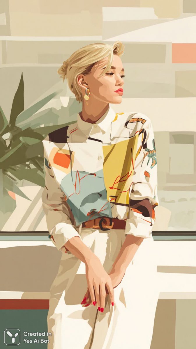 Изысканный городской стиль воплощен в образе модели, демонстрирующей современную интерпретацию поп-арта. Белоснежная рубашка с длинными рукавами служит идеальным фоном для яркого графического принта – завораживающего портрета прекрасной женщины, выполненного в духе культовых работ Энди Уорхола. Акцент на деталях подчеркивает безупречный вкус: маникюр в насыщенном красном цвете добавляет образу дерзости и элегантности. Вся композиция излучает непринужденную уверенность и легкость, характерные для современной повседневной моды. Светлое интерьерное пространство создает атмосферу уюта и подчеркивает естественную красоту модели. Этот образ – воплощение актуальных трендов, сочетающее в себе классическую элегантность и дерзкий поп-арт стиль, идеально подходящее для создания стильного и запоминающегося образа в городской среде. Это современная мода, которая говорит сама за себя, отражая индивидуальность и смелый вкус