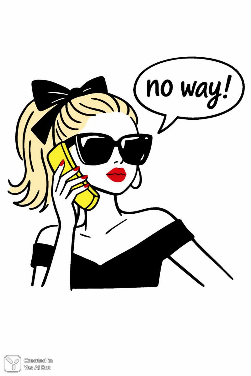 young woman with blonde hair in ponytail adorned with black bow, wearing oversized sunglasses, red lipstick, talking on yellow phone with one hand, standing confidently, speech bubble says "no way!", BG is plain white, cartoon-like style, primitive art, simple forms, line art, hand drawing.