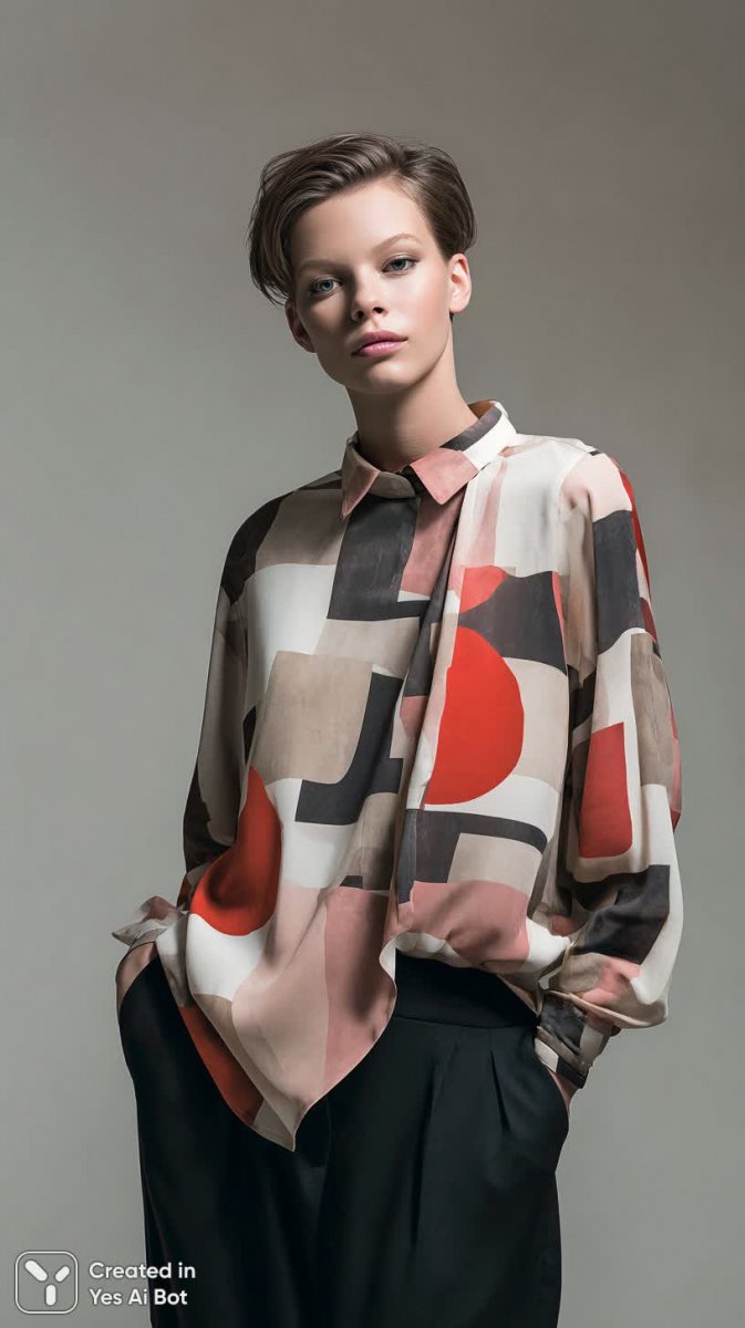 Завораживающий портрет современной женщины, воплощающей смелый и изысканный стиль. В центре внимания – модель с выразительным лицом, чьи ярко-красные губы становятся акцентом в динамичной композиции. На ней – стильный асимметричный блузон с крупным графическим принтом, демонстрирующий актуальные тренды современной моды. Иллюстрация выполнена в современном стиле, сочетая элементы абстрактного искусства и элегантной городской эстетики. Кажется, будто оживает яркий взрыв цвета и формы, передающий дух уверенности и индивидуальности. Этот образ – ода смелым решениям в моде, где каждый элемент призван подчеркнуть неповторимый стиль женщины, выбирающей уникальную одежду с запоминающимся принтом. Впечатляющее сочетание графики и портрета создает визуально насыщенную картину, отражающую современное представление об элегантности и самовыражении. Этот образ идеально подходит для тех, кто ценит смелые эксперименты в моде и стремится к созданию неповторимого образа, выделяющегося из толпы
