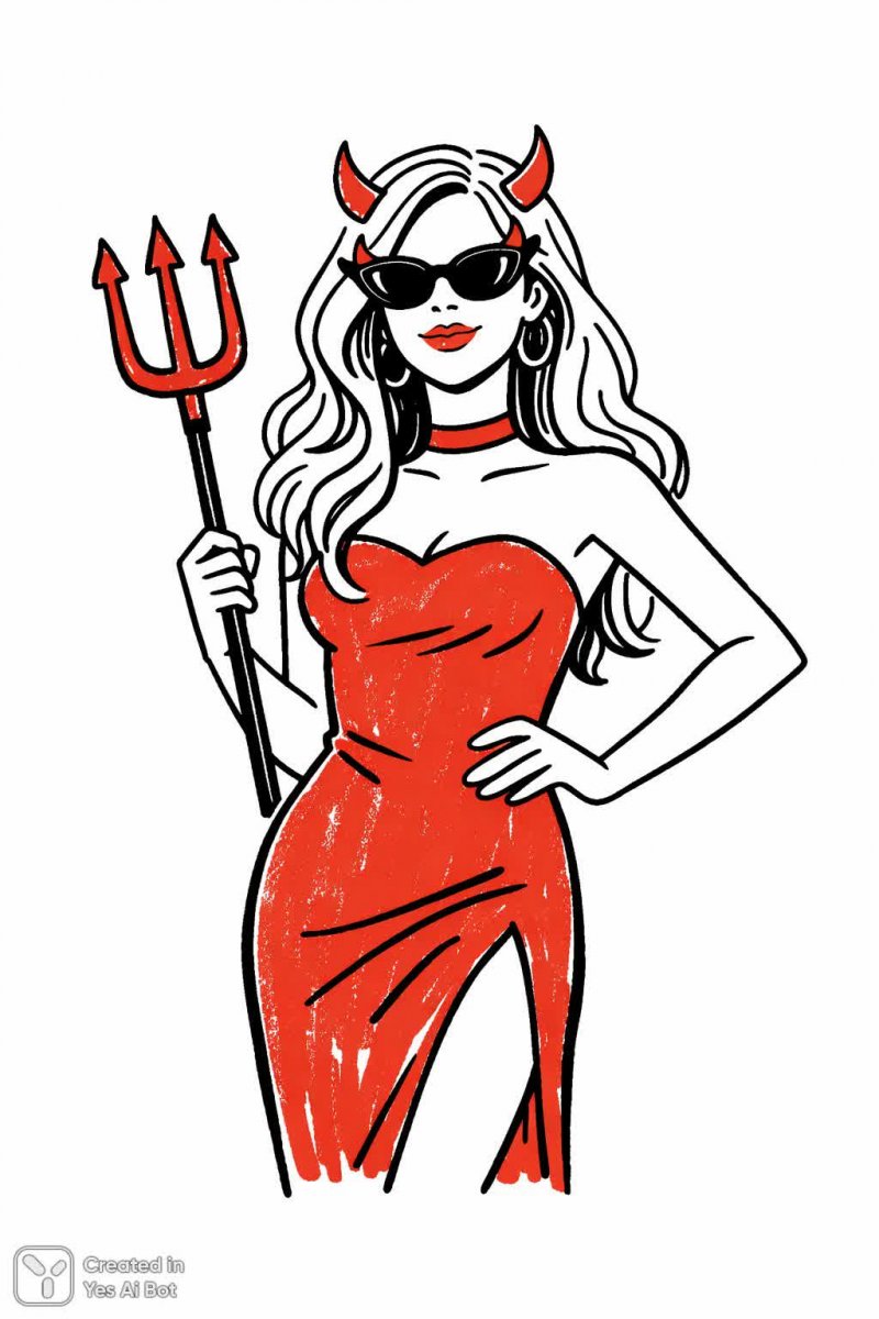 Демоническая красотка в стилизованном образе: яркая и запоминающаяся иллюстрация, выполненная в духе наивного искусства и простого рисунка от руки. В центре внимания – женщина с длинными волнистыми волосами, облаченная в облегающее красное платье с высоким воротником, подчеркивающим изящную шею. Она эффектно держит в правой руке традиционный символ зла – вилку-трезубец, а левая рука грациозно прислонена к бедру, создавая непринужденную и уверенную позу. Добавляет образу игривости и современности стильный аксессуар – солнцезащитные очки с рожками, гармонично сочетающиеся с демоническим образом. Фон выполнен в нейтральном белом цвете, позволяя полностью сосредоточиться на деталях персонажа и его выразительной мизансцене. Рисунок отличается четкими линиями, простыми формами и минималистичным подходом к цветовой палитре, характерными для примитивного искусства. Общий стиль иллюстрации напоминает мультяшную графику, что придает ей легкость и юмористический оттенок, смягчая потенциально зловещие атрибуты образа. Эта работа станет отличным украшением для дизайна, иллюстраций или просто подарит хорошее настроение своим созерцателем, сочетая в себе элементы фэнтези, моды и искусства. Она демонстрирует уникальное видение художником, умело сочетающим традиционные символы с современными тенденциями и стилем, создавая яркое и запоминающееся визуальное впечатление