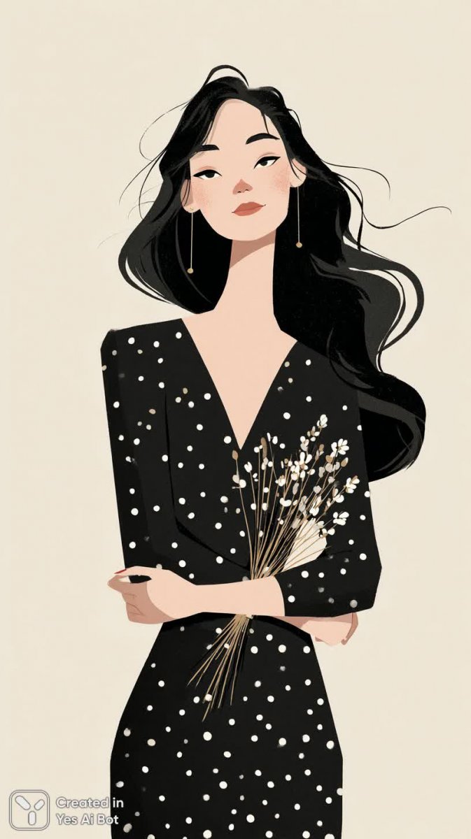 Изящная дама в элегантном черном платье, украшенном белыми горошинами, предстает перед нами с букетом цветов в руках и ножницами наготове. Ее длинные волосы, уложенные легкими волнами, подчеркивают женственность образа. В уверенной позе, она опирается рукой на бедро, демонстрируя грацию и спокойствие. На фоне простого, чистого белого пространства, создается ощущение легкости и воздушности. Стиль изображения выполнен в манере мультфильма, что придает картине игривость и очарование, делая ее привлекательной для широкой аудитории. Эта работа воплощает собой классическую красоту и элегантность, сочетающую в себе простоту и изысканность. Отражение стиля ретро добавляет шарма и ностальгии, перенося нас в эпоху гламура и очарования. Вся композиция пронизана легкостью и позитивом, вызывая приятные эмоции и ассоциации с весенним настроением и радостными событиями