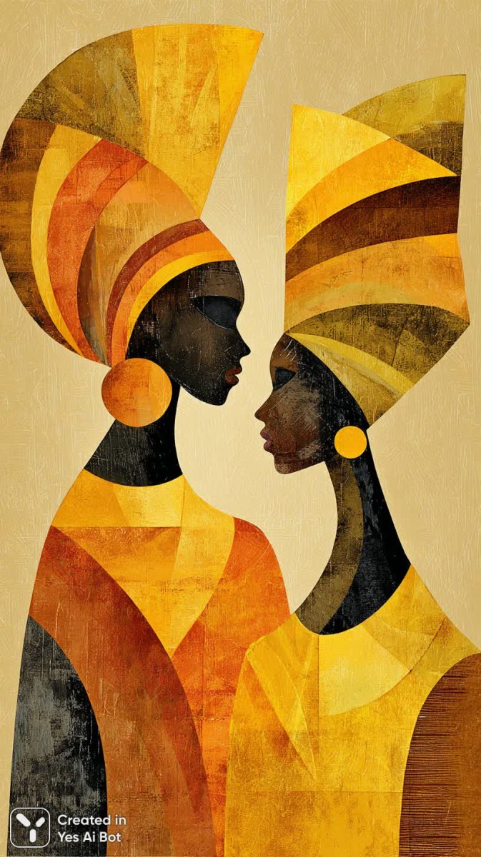 Две африканские женщины в традиционных нарядах смотрят друг на друга на фоне градиента оранжевого и желтого цветов. Яркие головные уборы подчеркивают их индивидуальность и культурную принадлежность. Стиль изображения минималистичен, сочетая плавные изгибы с четкими геометрическими формами, создавая гармоничный визуальный баланс. Картина выполнена в абстрактной манере, акцентируя внимание на цвете и форме, а не на реалистичном изображении. Изображение представлено в формате png, что обеспечивает высокое качество и прозрачность фона, делая его идеальным для различных цифровых применений. Композиция создает ощущение диалога или противостояния между двумя женщинами, при этом яркие цвета и абстрактный стиль придают работе динамизм и эмоциональную глубину. Это произведение искусства – воплощение африканской культуры и традиций, представленное в современном и лаконичном ключе. В целом, работа производит впечатление спокойствия и уверенности, благодаря выбранной цветовой палитре и сбалансированному сочетанию форм
