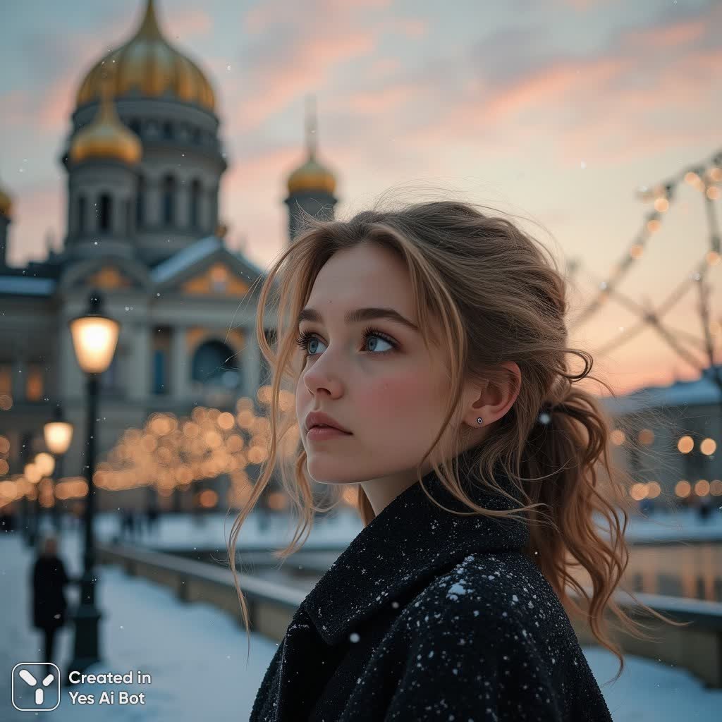 Загадочная красота в объятиях архитектурной элегии. Молодая европейка, словно сотканная из света и тени, застыла в задумчивом профиле, органично сливаясь с величественным фоном. Черный шерстяной плащ, мягкий на ощупь, подчеркивает безупречность ее кожи и глубину пронзительных голубых глаз, обрамленных длинными темными ресницами. В ее взгляде читается спокойствие и легкая саморефлексия, словно она погружена в свои размышления, отдаляясь от суеты окружающего мира. Ее образ наложен на изображение монументального здания с золотым куполом, детали которого едва угадываются сквозь пелену времени и воспоминаний. За окном – городская площадь, окутанная сумраком вечера и легким снегом. Мерцающие гирлянды создают мягкий эффект боке, рассыпаясь яркими бликами на фоне нежно-розового и оранжевого неба. Вся композиция пронизана атмосферой тихой задумчивости и ностальгии, словно запечатленный момент из сновидения, где реальность переплетается с внутренним миром. Это гармоничное сочетание внешнего великолепия архитектуры и внутреннего покоя человеческой души, воплощенное в импрессионистской манере исполнения. Кажется, что этот образ хранит секрет, призывая зрителя задуматься о вечных вопросах бытия и красоте мгновения. Изящная игра света и тени создает ощущение эфемерности и легкости, оставляя после себя неизгладимое впечатление утонченной элегантности и глубокой эмоциональности