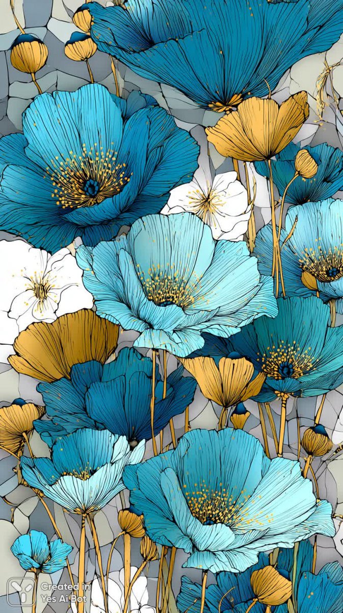 zentangle a modern artistic depiction of flowers with intricate linework and vibrant colors including blue, black, and yellow, creating a lively and playful scene.