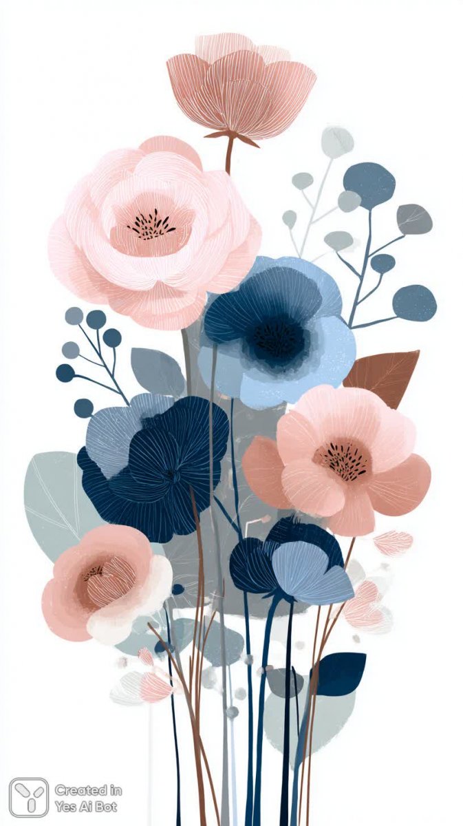 Иллюстрация представляет собой яркую, жизнерадостную цветовую композицию, где доминируют крупные цветы в нежных оттенках розового и глубокого синего. Каждый цветок уникален благодаря игривым узорам, украшающим их лепестки, создавая ощущение легкости и беззаботности. Темные, фактурные стебли придают изображению глубину и основательность, контрастируя с воздушностью цветов. Вокруг буйного цветочного великолепия раскинулись тщательно прорисованные листья, выполненные в технике свободного наброска, что добавляет композиции естественности и ручной работы. Вся картина излучает позитивную энергию и вызывает ощущение свежести, словно весенний луг, наполненный ароматами цветущих растений. Детализированная проработка каждого элемента – от изгибов стеблей до мельчайших прожилок на листьях – свидетельствует о мастерстве художника и внимании к деталям. Использование насыщенных цветов в сочетании с темными акцентами создает гармоничный баланс, делая изображение привлекательным для широкого круга зрителей. Это произведение искусства станет прекрасным украшением любого интерьера или вдохновит на создание собственного цветочного шедевра. Яркие краски и игривые узоры гарантированно поднимут настроение и добавят нотку радости в повседневную жизнь