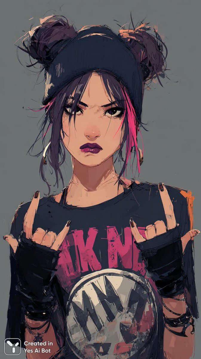 Завораживающий образ девушки в стиле эмо, сотканный из бунтарства и меланхолии. Длинные черные волосы с дерзкими розовыми прядями обрамляют лицо, а косые челки добавляют шарма и индивидуальности. Небрежные пучки на макушке увенчаны черной вязаной шапкой, завершая стильный ансамбль. Футболка с принтом культовой панк-группы подчеркивает музыкальные предпочтения и бунтарский дух. Пальцы украшают сетчатые перчатки без пальцев, добавляя образу нотку дерзости и провокации. Темный макияж и черная помада акцентируют драматизм взгляда, а интенсивный подводкой подчеркивает глубину эмоций. Серьезное выражение лица говорит о внутренней борьбе и переживаниях. Уличный стиль воплощает дух свободы и непокорности. Рука, поднятая в значении рока, символизирует энергию и страсть. Фон – серый городской пейзаж с размытым указателем, создающий ощущение потерянности и одиночества. Меланхоличная атмосфера пронизывает весь образ, передавая сложность чувств и переживаний молодой девушки. Иллюстрация выполнена в стиле комикса, придавая изображению динамичность и экспрессивность. Это визуальное повествование о бунте, эмоциях и поиске себя в мире, полном противоречий. Яркий акцент на деталях – от прически до макияжа – создает целостный и запоминающийся образ