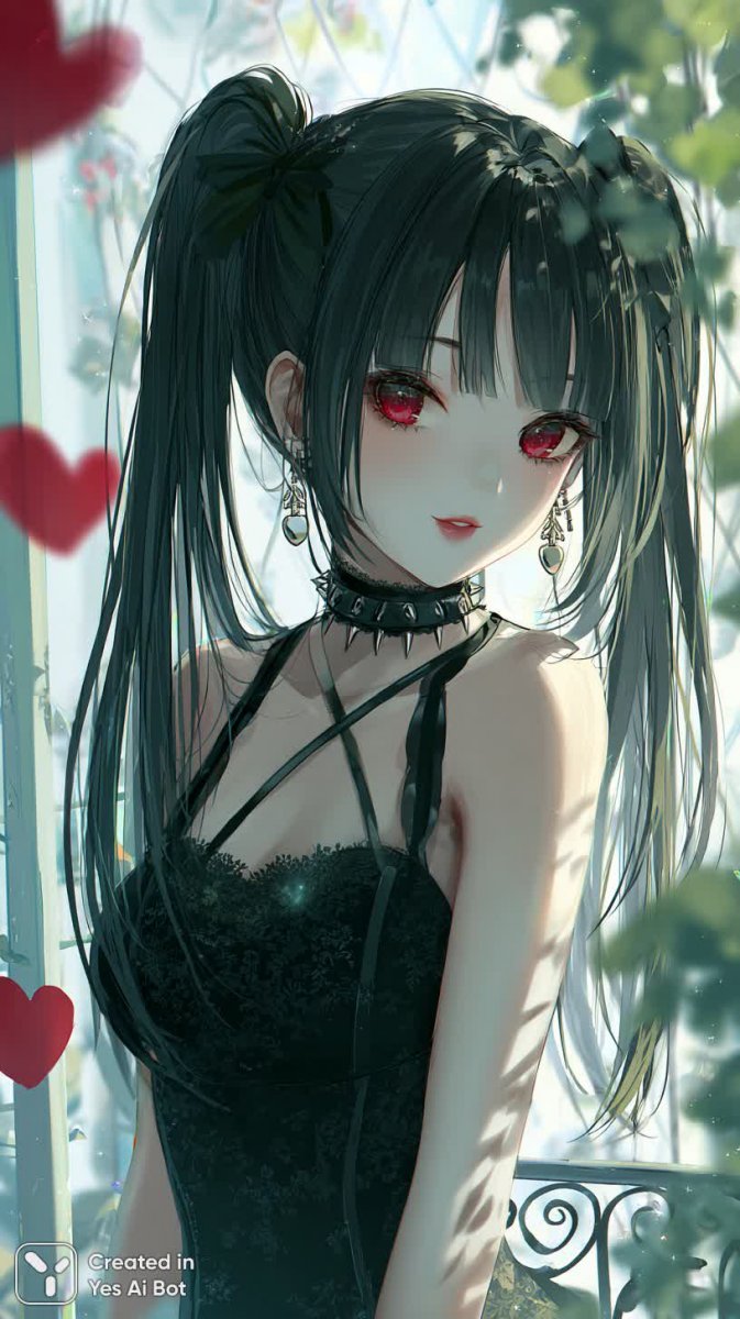 Восхитительная иллюстрация в современном стиле аниме представляет собой девушку с длинными черными волосами, собранными в два косички-хвостика, обрамленные игривыми прядями челки. Ее лицо украшает драматичный макияж, подчеркивающий большие выразительные глаза с завораживающими красными зрачками и нежные румяна на щеках. Тело девушки покрыто красочными татуировками в виде цветов и сердец, символизирующими ее яркую индивидуальность и внутренний мир. Она одета в облегающее черное кружевное платье с эффектными вырезами, дополненное изящными украшениями на шее и ухе, а также дерзким чокером с шипами и кожаными ремнями, создающими неповторимый образ. Девушка застыла в очаровательной позе, излучая уверенность и грацию. Фон представляет собой балкон с перилами и размытыми деревьями, окутанный утренним светом, который мягко освещает сцену. В воздухе парят нарисованные сердца, создавая атмосферу романтики и волшебства. Изящные детали и нежная цветовая гамма подчеркивают красоту персонажа и общее настроение иллюстрации, делая ее поистине завораживающей и запоминающейся работой современного художника аниме. Каждая деталь продумана до мелочей, от тщательно прорисованных татуировок до мягкого рассеянного света, создающего ощущение реализма и глубины изображения. Это произведение искусства – настоящий гимн красоте, молодости и индивидуальности