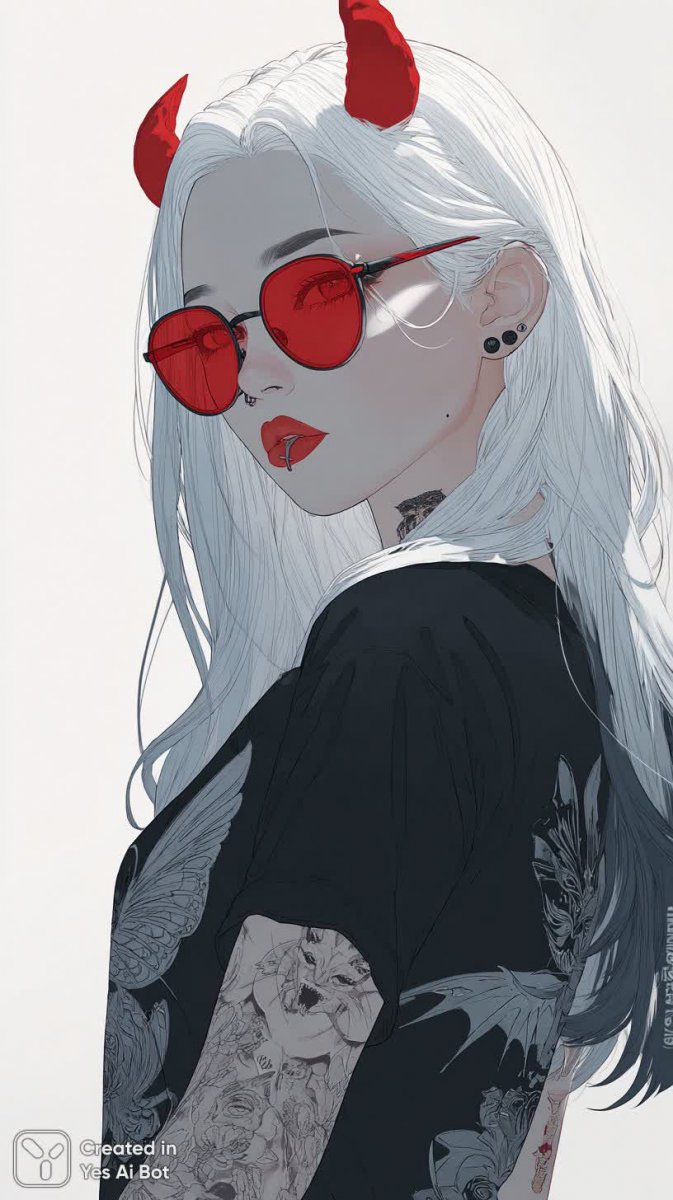 Завораживающий образ девушки с демоническим очарованием – воплощение бунтарства и дерзости в готическом стиле. Яркий контраст красного и черного подчеркивает ее двойственную натуру: рога цвета воронова крыла, длинные волосы, разделенные на белоснежную и угольно-черную половины, создают ощущение потусторонней красоты. Пронзительные красные глаза, скрытые за стильными солнцезащитными очками, излучают загадочность и вызов. Татуировки на руках – это история ее внутренних переживаний и непокорности условностям. Черная футболка с надписью amiru и изображением злого кота добавляет образу нотку иронии и провокации. Ремни на руках и ногах акцентируют динамичность и готовность к действию. Высунутый язык – демонстрация безрассудства и свободы от правил. Детали, такие как серьги и пирсинг, подчеркивают индивидуальность и бунтарский дух. Фон в белых тонах создает эффект контраста и позволяет полностью сосредоточиться на выразительном образе этой дерзкой и неповторимой девушки, словно сошедшей со страниц фэнтезийного романа или из мира аниме. Она – воплощение темной элегантности и силы духа, готовой противостоять любым вызовам. Ее образ пропитан мистицизмом и притягательностью, заставляя зрителя задуматься о скрытых глубинах ее души. Этот персонаж - яркая иллюстрация готической эстетики с элементами панка и альтернативной моды