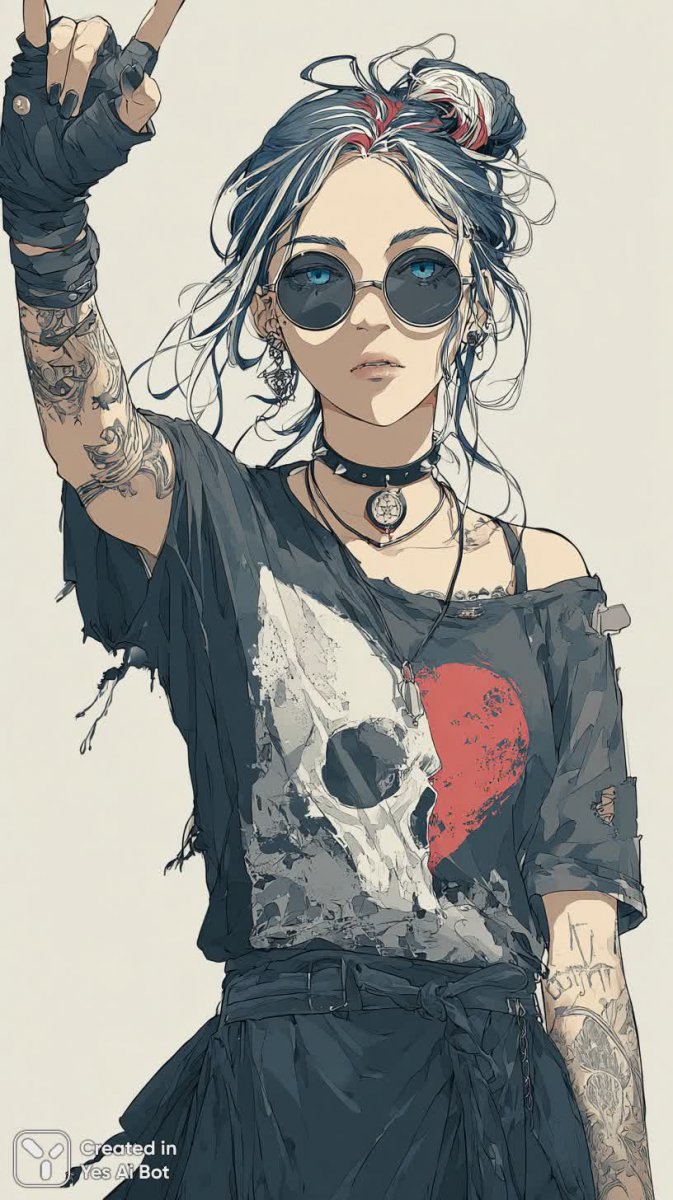 Яркий портрет девушки в стиле эмо с бунтарским духом и глубоким взглядом. Длинные растрепанные волосы, окрашенные в контрастные белый и красный цвета, обрамляют лицо, подчеркнутое густыми черными стрелками и круглыми темными очками. Выразительные голубые глаза полны эмоций, а татуировка в виде сердца под глазом добавляет образу трогательности. Девушка одета в черную футболку с принтом черепа, на шее – чокер с подвеской, а руки украшают сетчатые рукава и множество пирсингов. Дерзкий образ завершает мини-юбка в сочетании с полосатыми колготками и поднятая вверх рука в характерном рок-жесте. На предплечьях видны татуировки, свидетельствующие о свободолюбивом характере. Фон – нейтральный серый цвет городского пейзажа подчеркивает динамичность и энергию снимка, акцентируя внимание на деталях костюма и выражении лица модели. Это полный кадр, позволяющий рассмотреть каждую деталь бунтарского стиля и прочувствовать атмосферу молодости и протеста. Изображение воплощает дух панк-культуры и самовыражения, передавая мощный заряд энергии и индивидуальности