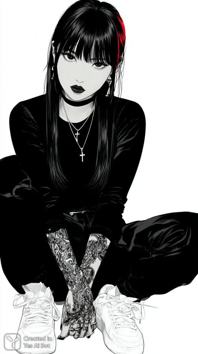 Загадочная и дерзкая героиня в стиле эмо-готик аниме, воплощение бунтарства и эстетики тьмы. Нежная фарфоровая кожа контрастирует с графичностью черных прямых челок, подчеркнутых акцентами насыщенного красного цвета. Образ завершает стильная кожаная куртка, соблазнительный топ и смелое сочетание с красными трусами, добавляя нотку провокации. Черный чокер с крестом – символ индивидуальности и непокорности, а белые кроссовки привносят элемент уличной моды. Татуировки на теле рассказывают свою историю, а темная помада подчеркивает решительный взгляд. Фон в стиле минимализма акцентирует внимание на силуэте модели, запечатленной в агрессивной позе с согнутым коленом и уверенным прямым взглядом. Яркое аниме-освещение создает драматическую атмосферу, придавая портрету глубину и выразительность. Эта девушка – воплощение современной бунтарки, сочетающей в себе хрупкость и силу, нежность и дерзость, создавая неповторимый образ, пленяющий своей загадочностью и эстетикой. Она словно сошла со страниц любимого аниме-журнала, готовая покорить мир своим уникальным стилем и харизмой